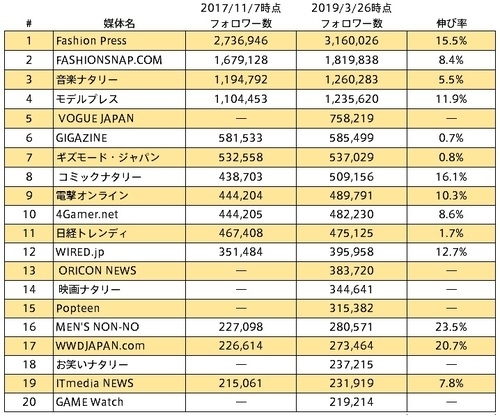 最新版 Web媒体 公式ソーシャルメディアフォロワー数ランキング 2019年3月 Pr会社 ビルコム株式会社