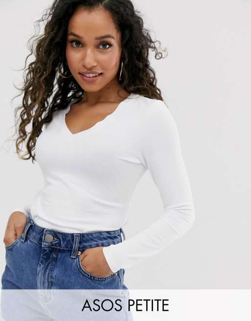 Asos Design Petite V Neck Long Sleeve T Shirt In White Asos